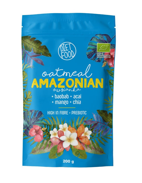 The Amazonian Bio Oatmeal is a guarantee that the ingredients for its production have been grown in harmony with nature, which reduces exposure to toxic synthetic chemicals and genetically modified seeds. No genetic engineering was used at any stage to grow the ingredients or to produce this porridge. At Diet-Food, we are committed to feeding you only organic, non-GMO ingredients. It is a better choice for our bodies and health. In this unique product, you will not only find organic healthy ingredients, to emphasize the uniqueness and enlarge the spectrum of positive effects on the consumer's body, we have added a prebiotic to the composition. Inulin is a type of fiber found in plants that consists of simple sugar fructose, it can lower blood sugar and fat, and increase weight loss.Właściwości inuliny: